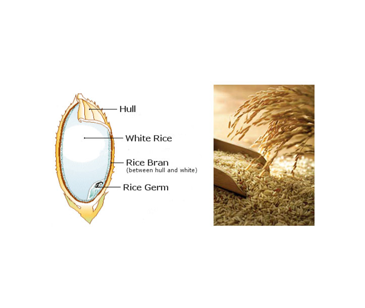 Rice bran is the layer between the inner white rice grain and the outer hull.